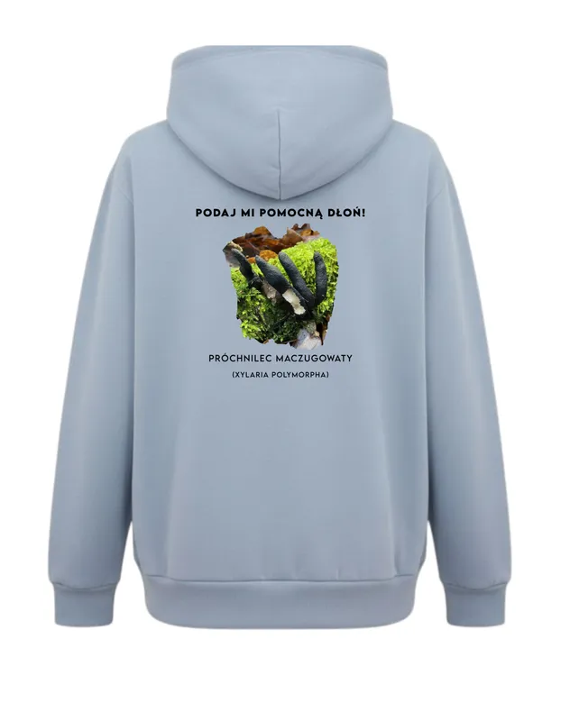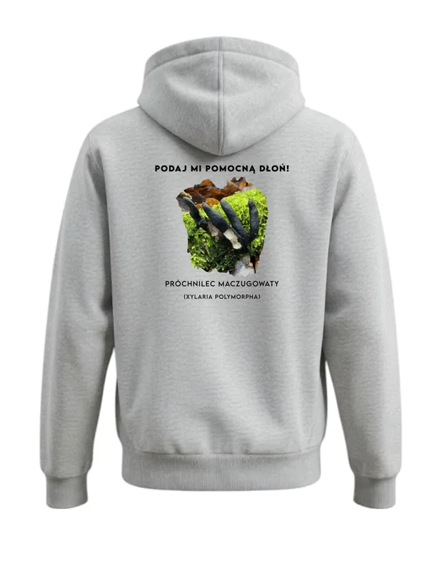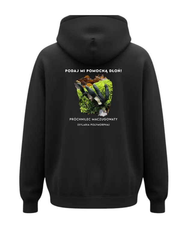 - Zabawne przesłanie: Hasło “Podaj mi pomocną dłoń” nadaje bluzie humorystycznego charakteru i nawiązuje do nazwy potocznej grzyba – palce umarlaka.