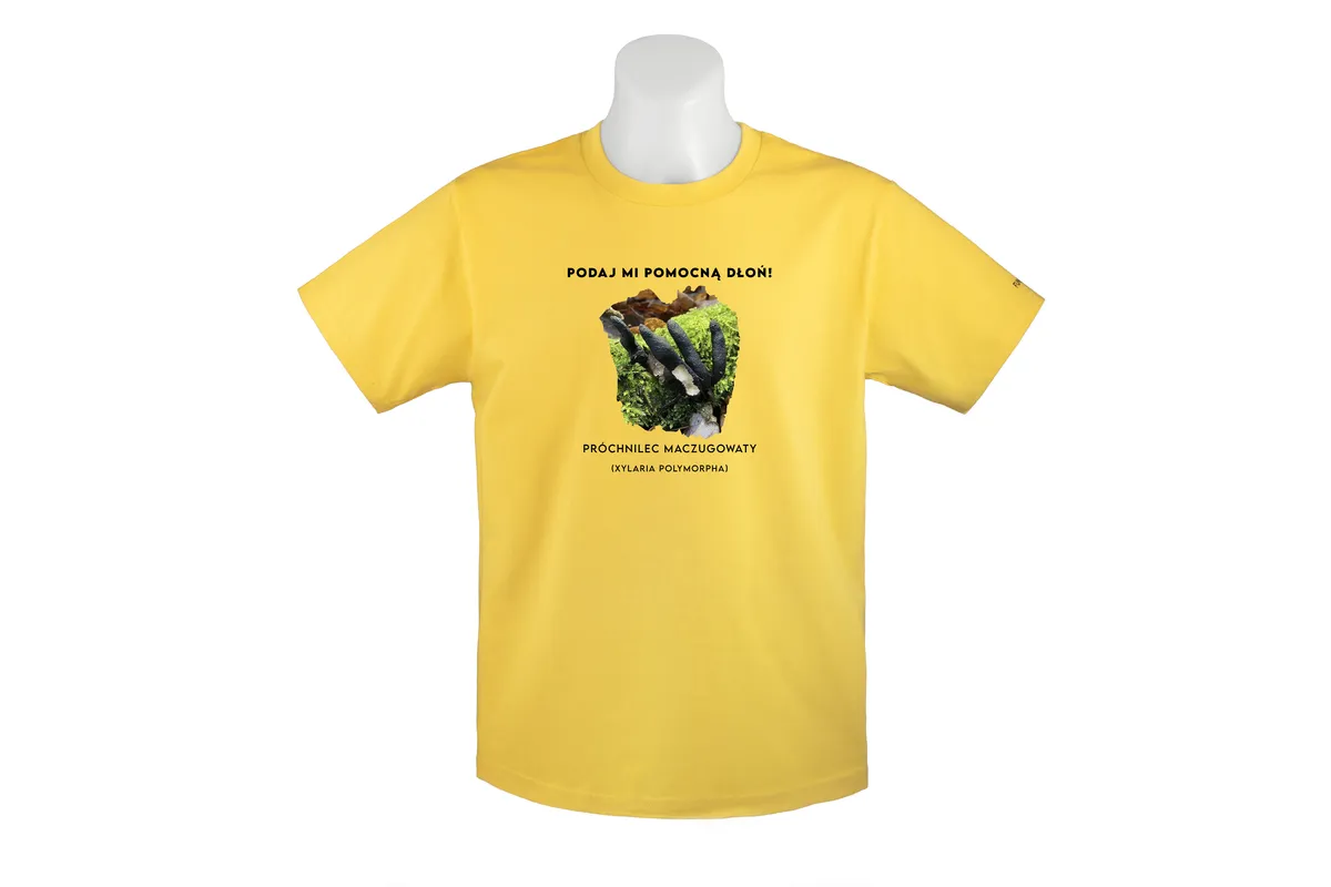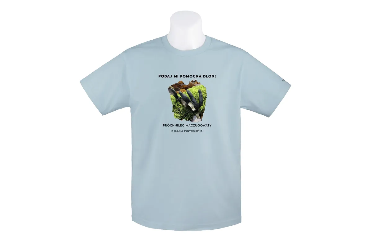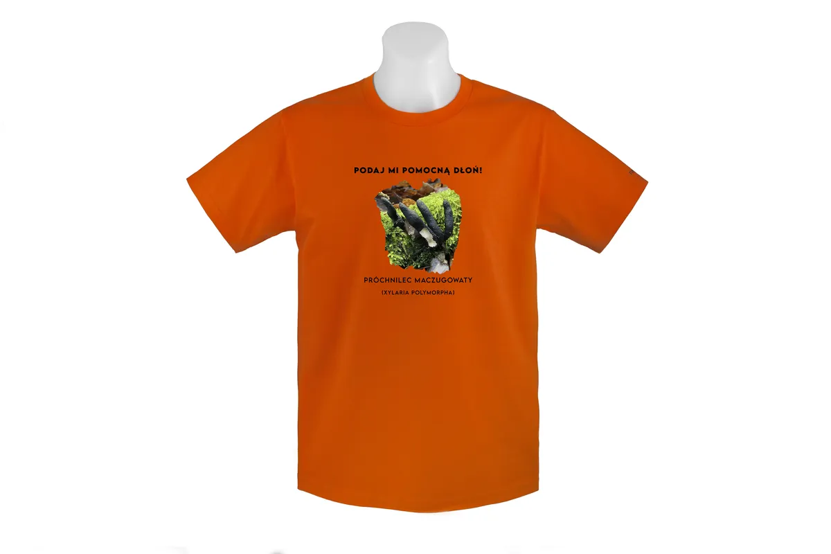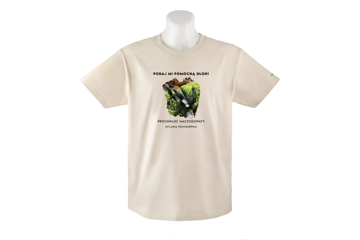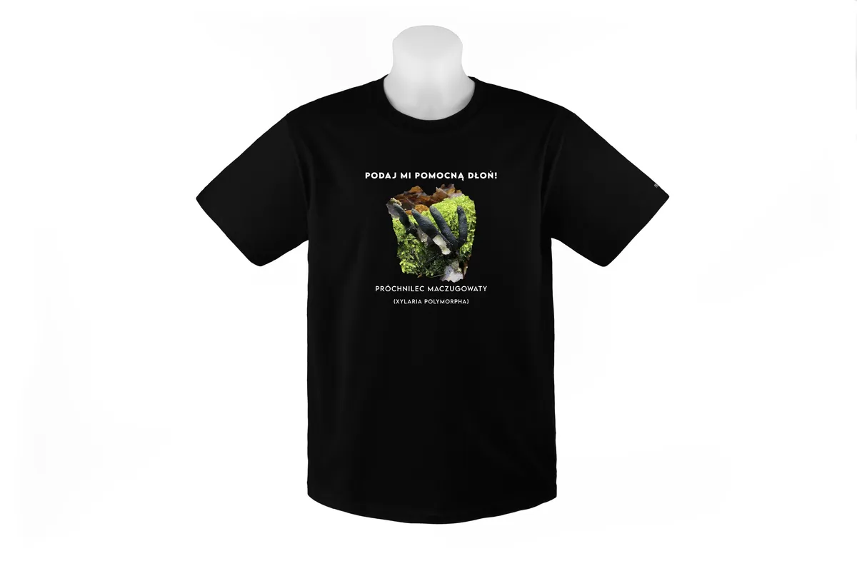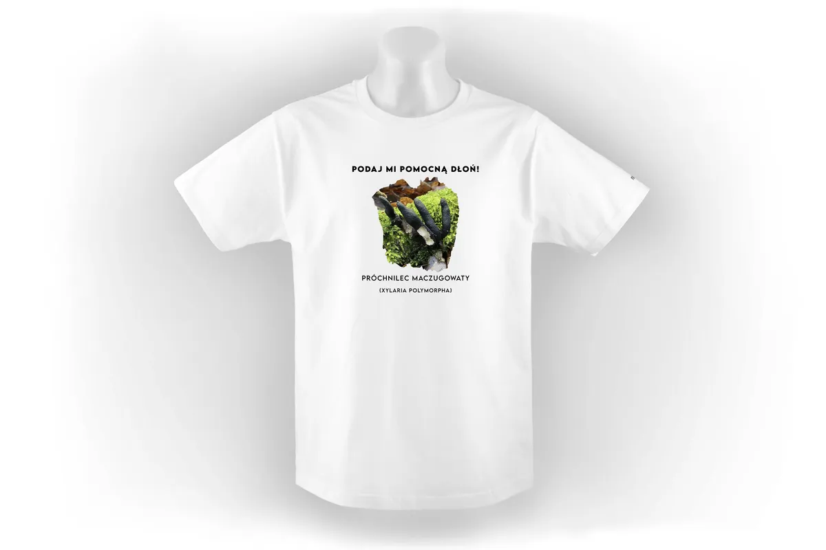 - Zabawne przesłanie: Hasło “Podaj mi pomocną dłoń” nadaje koszulce humorystycznego charakteru i nawiązuje do nazwy potocznej grzyba – palce umarlaka.